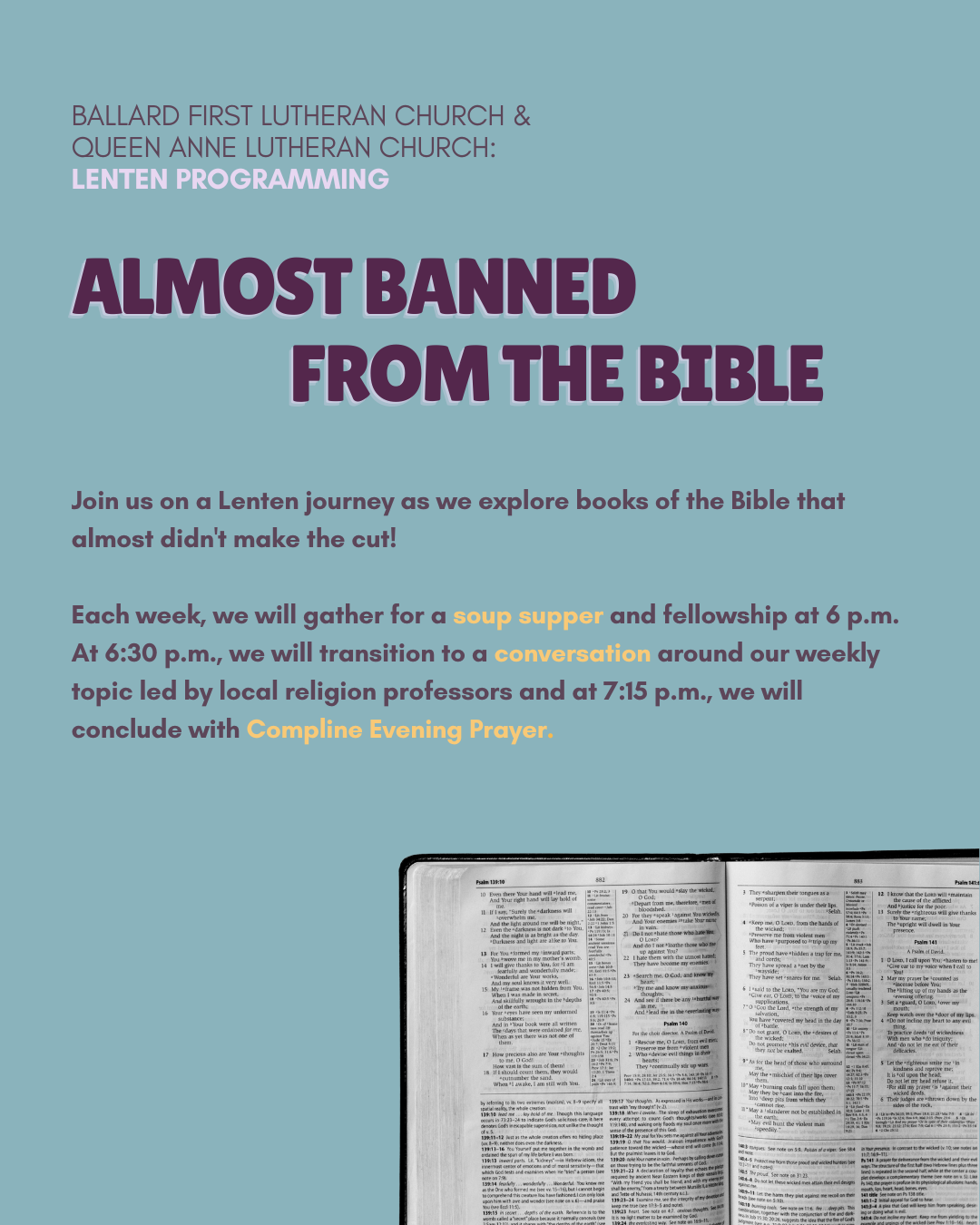 An evening series in collaboration with Ballard First Lutheran, “Almost-Banned from the Bible” will include a light soup-supper (6:00-6:30 pm), speaker/discussion (6:30-7:15 pm), and compline worship to close (7:15-7:30 pm).